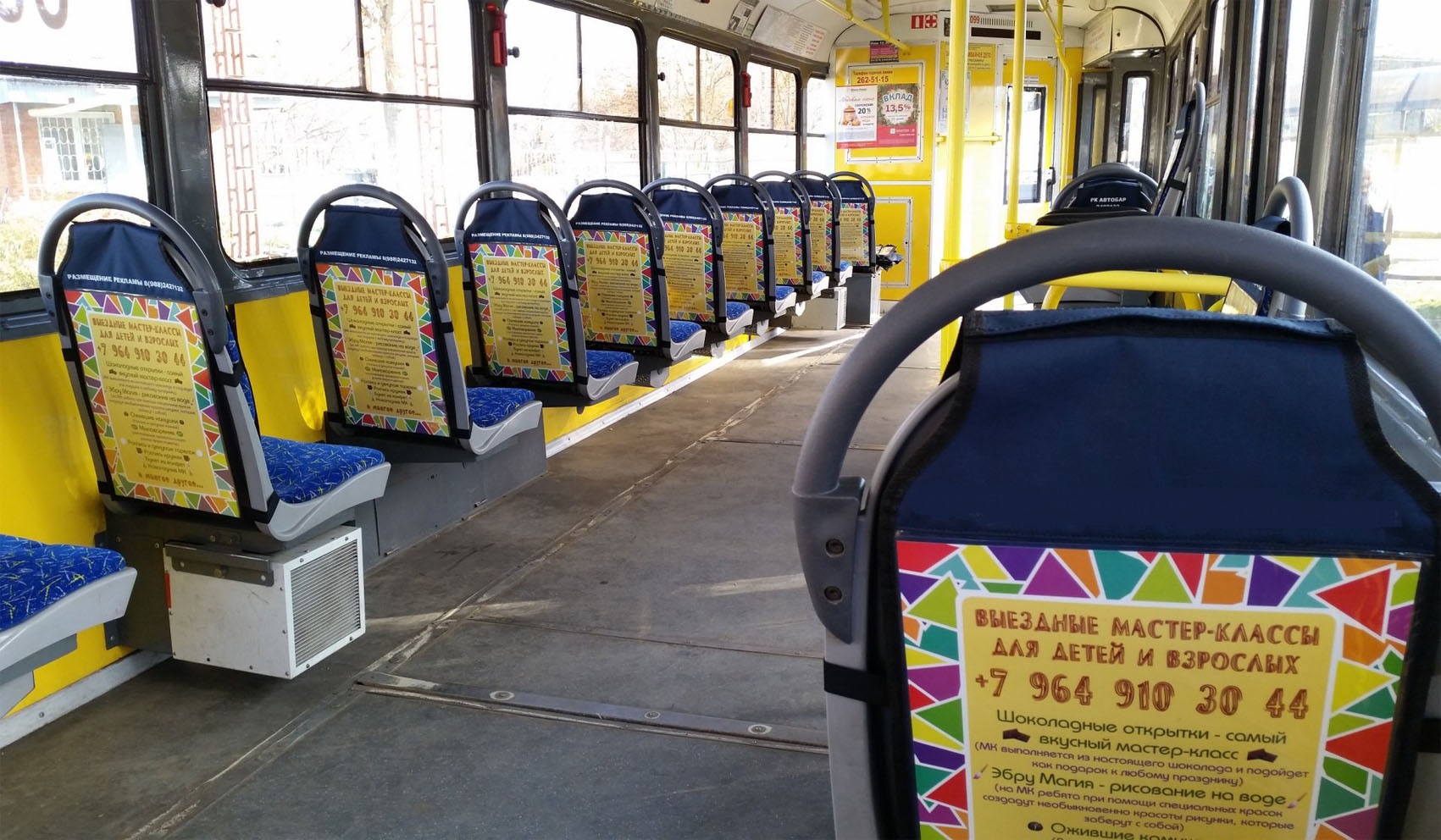 Реклама на подголовниках в транспорте на фото выше